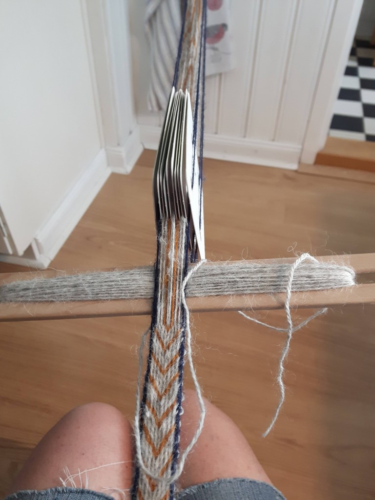 My son and I have for quite a long time talked about making a set of clothes from pre-Viking age, it might be both a male and female set. We haven’t come up with a decision on fabric yet, but to start with a have made the first attempt in tablet-weaving. A very clever method for making fine ribbons used at the time. Clothes were often lined with elaborate tablet-weaved ribbons. You use a tablet with four holes threaded with yarn in different colours. By turning the tablets in various directions you weave the pattern. It is quite complicated and I have to practise more, especially to get the edges straight. But it’s fun!