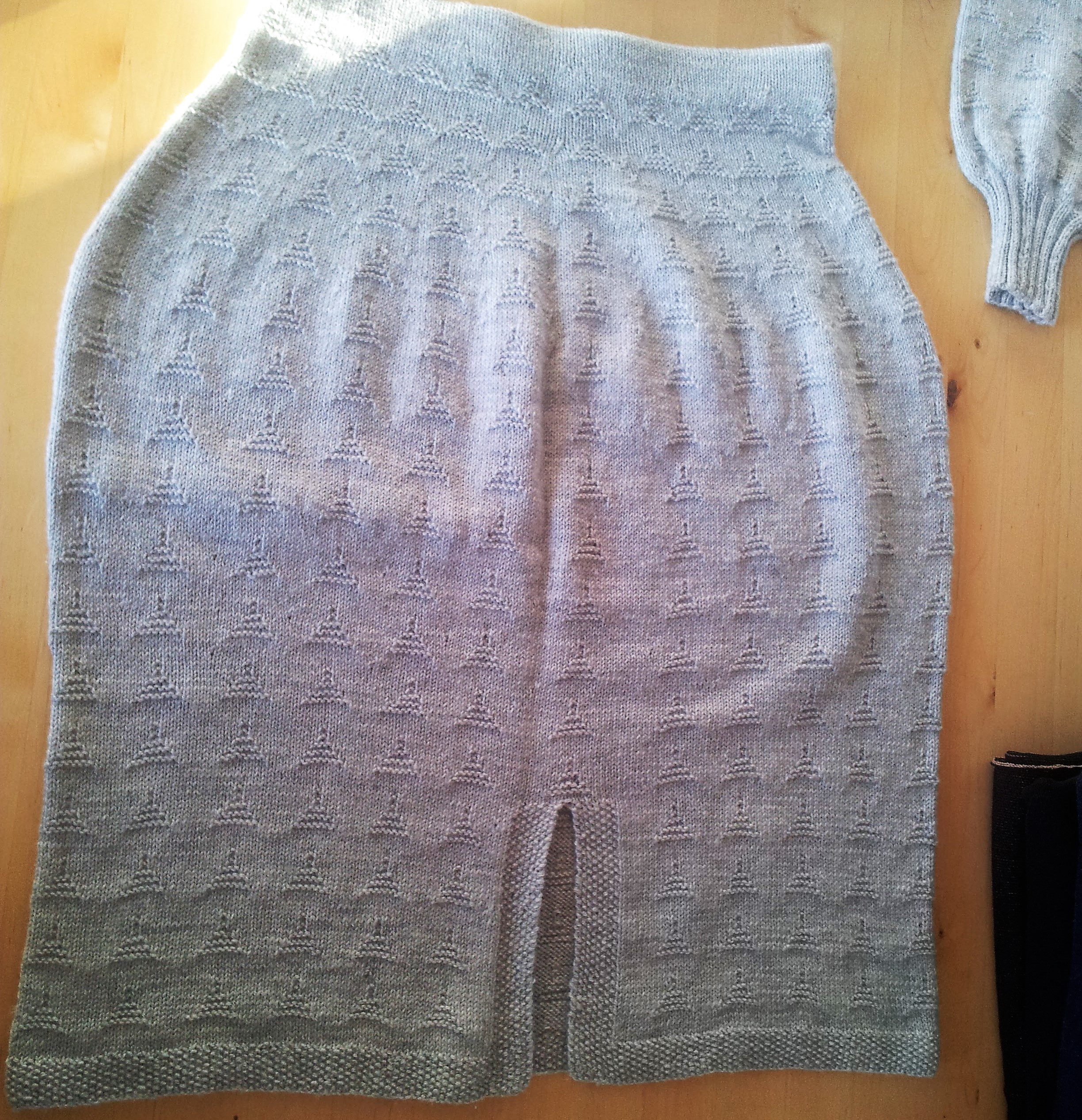 To the left a sweater with patterns from different villages in Cornwall. The colour is not typical for Cornwall knitted garments traditionally, they are usually white, dark blue or grey.  But I like green. To the right a knitted costume I made for my daughter. The pattern is from Looe in Cornwall the design is taken from other garments she likes. All knitted in baby merino yarn, a wonderfully soft yarn.
