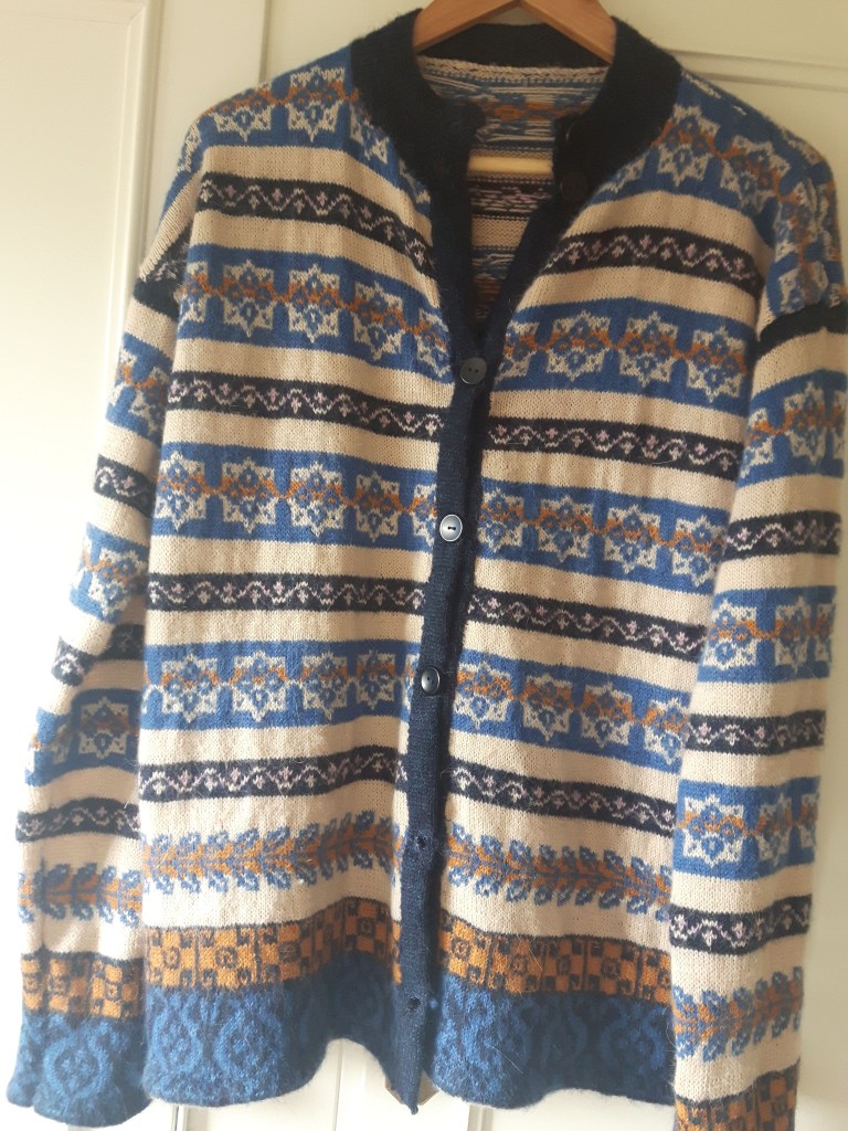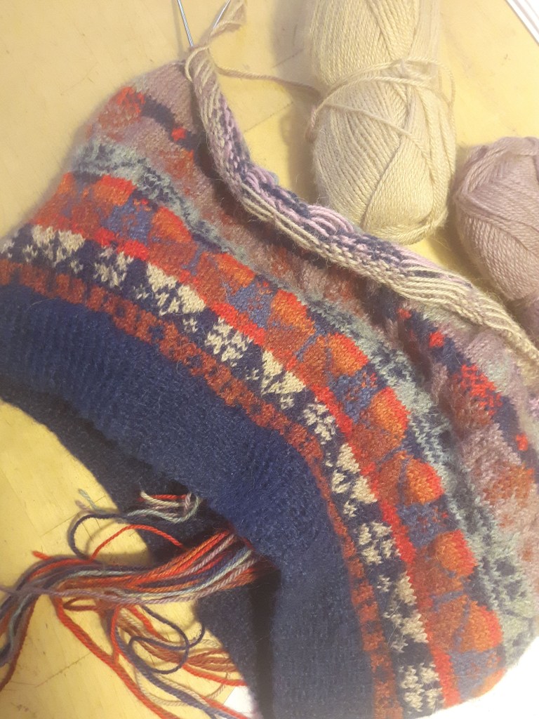 I have loved knitting most if my life. It is relaxing and creative. It is also useful, knitted garments are popular, my children and myself often wear my creations. The British isles have a long tradition of knitting as well as Scandinavia. I use patterns from both. I have a wonderful book with old patterns from Gotland and another one from Cornwall. I found this book in “The museum of fishing and smuggling” in the little fishing village Polperro.  In Cornwall the fishermen wore homemade “Guernsey frocks” (sweaters) and the villages had patterns of their own. During the 19th century village women produced large quantities of knitwear for sale which provided extra income to the family. Shetland isles have the most elaborate and colourful patterns in Britain. Alice Starmore lives in Scotland and has collected patterns from Scotland, Scandinavia and many other countries. She has published many books and has a web shop with books and yarns. It is highly recommended!