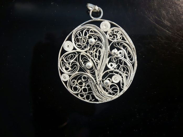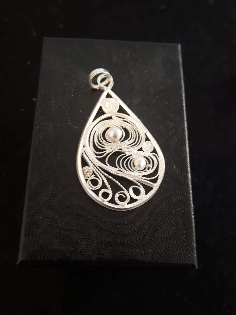 I made this pendant to the left at my course in Portugal, I completed it at home. The tricky moments are when the wires accidentally pop out from the frame wire and end up on the floor, never to be found! Or when you heat the wires too much when soldering and the whole piece melts and it is ruined. But sometimes I manage to complete it.