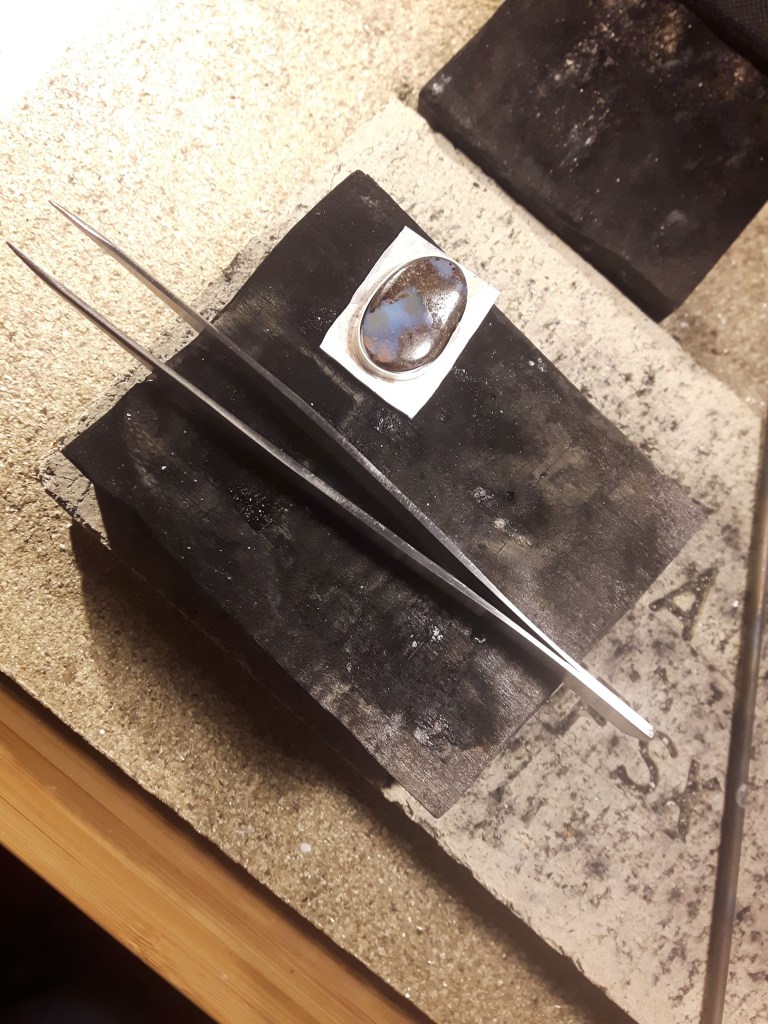 From left: a cabochon ready for setting, next set with Swedish blue slag, an unusual stone that I have written a blog post about. Next, you see the process of cabochon making, a bezel strip is soldered to a plate. Here the fitting of the stone checked, then you file down the plate to the preferred shape, polish and finally set the stone. This is a boulder opal.