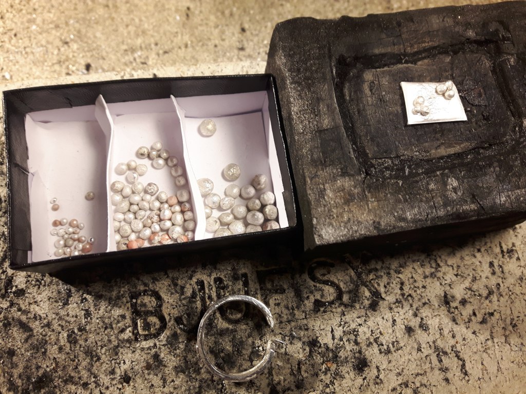 Very soon when I started making silver jewellery I realized that there would be an increasing amount of scrap silver, and you have to do something about it. The easiest thing to do is to melt small pieces to become spheres or grains. This is a natural process common to all kind of metals. Like magic the first time you see it! The grains are nice to solder on to decorate rings, pendants and other pieces of jewellery.