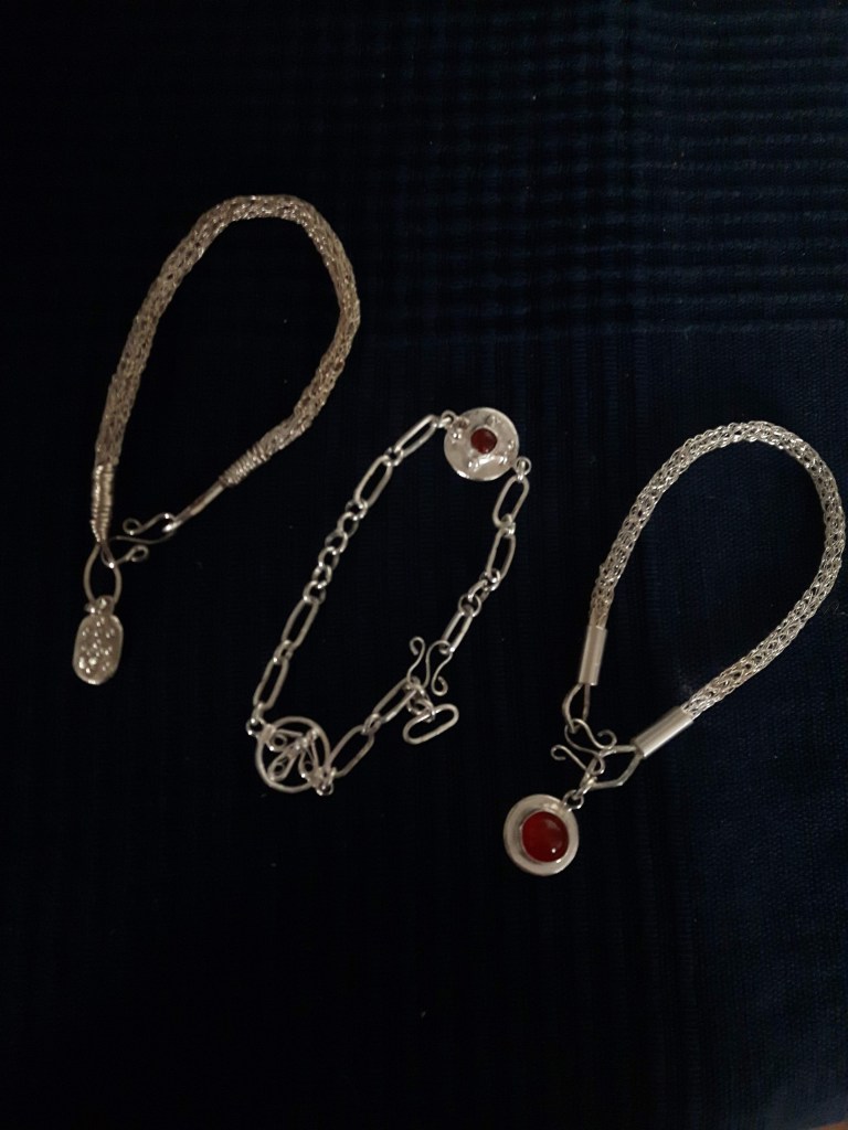 Bracelets with charms, one with chain links, two with knitted Viking chains.