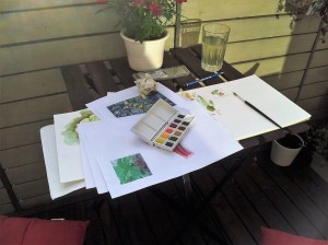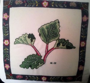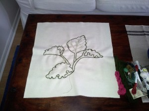 A couple of friends asked me to make a wall hanging for their summer cottage. The cottage is in an area where a lot of rhubarb and old sorts of apples and pears are cultivated. So we decided the wall hanging should be an embroidery of a rhubarb plant.