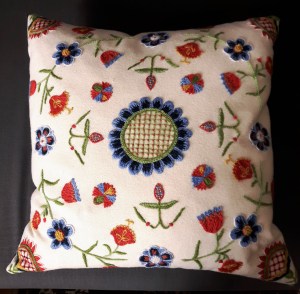 Wool embroidery is a freestyle embroidery where all kind of stitches may be used. The only thing in common is the woollen thread. There is a strong tradition of wool embroidery in Sweden, especially in the counties of Skåne and Dalarna. Craftswomen in the past used their creativity and embroidered just anything they saw around them, like animals, people, plants, and houses. Most often wool yarn on wool fabric was used, occasionally it could be silk thread. Embroidery was a highly esteemed profession, and embroiders moved around and made cushions and sledge quilts on demand. Wool embroidery is still popular and there are a variety of courses and quite a few books with patterns. The beautiful and instructive pictures you find in these books could be useful even for a person who doesn’t know Swedish.