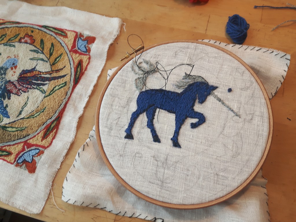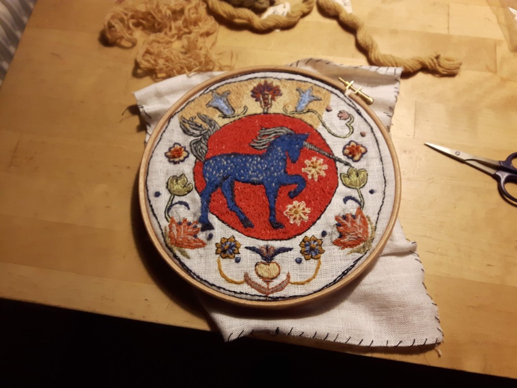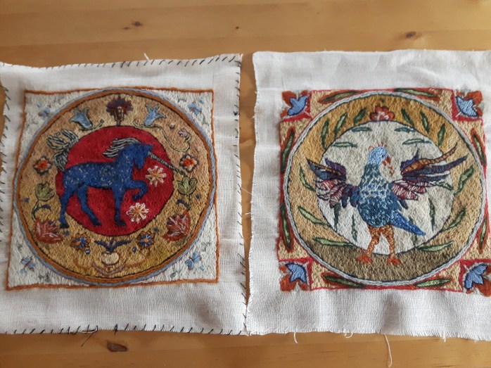 “Skapande broderi”, or Creative embroidery”, is an association with enthusiasts who love creative textile works. Collaboration with museums in Stockholm has resulted in exhibitions with the works of the members. One project was medieval inspired work in collaboration with the Swedish History Museum. During that period I stitched those two pictures.